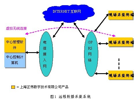 遠程數據采集系統,采用GPRS無線傳輸方式,實現低成本的,實時在線的,全市,全國范圍的流量計和溫度計等數據采集終端管理和監測。能在1-2秒內監測到全地區任何地方的采集終端,并在上位機上顯示報警等功能,是目前反應速遞最快,成本最低的監測系統。在后期更可以增加現場遠程拍照功能。